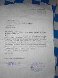 Uganda Today is in possession of formal complaints authored by aggrieved employees of the cleaning firm, including a written petition addressed to the Permanent Secretary of the Ministry of Gender, Labour and Social Development. The petition lays bare months of unpaid wages, arbitrary dismissals, and persistent intimidation from company management.