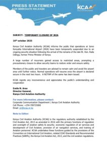 The Kenya Civil Aviation Authority (KCAA) confirmed in a press statement that operations at JKIA were temporarily suspended following the breach of restricted areas. The authority described the shutdown as a precautionary measure to restore order and ensure the safety of travelers, staff, and mourners.