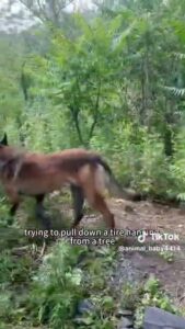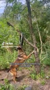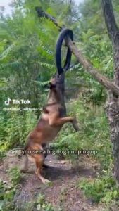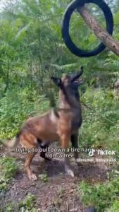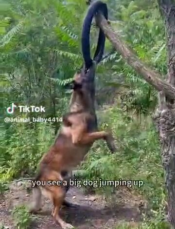 In what can only be described as a display of high-level problem-solving, the dog first identifies a motorcycle tyre hanging on a tree branch nearby—presumably placed there as a plaything or training object. Understanding its potential as a flotation device, the dog tries in vain to leap and retrieve it directly. Despite multiple attempts, the tyre remains out of reach.