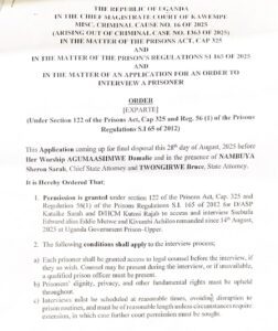 According to Kyagulanyi, police officers armed with a court directive showed up at Luzira on Thursday morning seeking to question NUP’s head of security Achileo and Eddie Mutwe—both of whom were previously abducted, tortured, and detained illegally before being formally committed to prison.