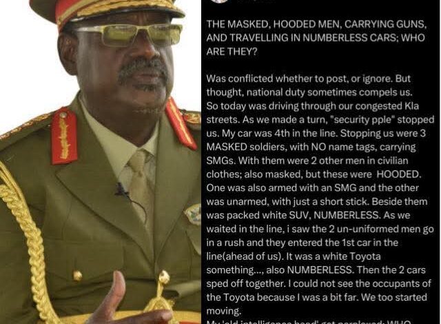 According to the account General Sejusa cited — based on eyewitness observations — motorists navigating congested Kampala streets were unexpectedly halted by individuals described as masked and heavily armed.
