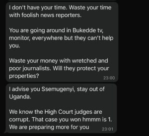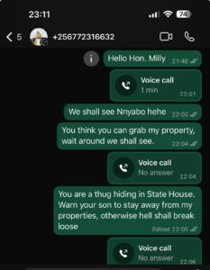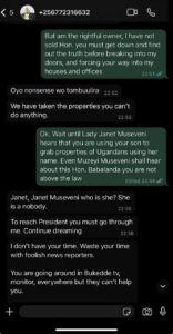 Uganda Today has obtained WhatsApp exchanges purportedly between Dr. Ssemugenyi and Minister Babalanda, in which she is said to have warned him to “back off” the property. In one exchange, Babalanda allegedly declared that they had already taken possession and advised Ssemugenyi to “live with that fact.”