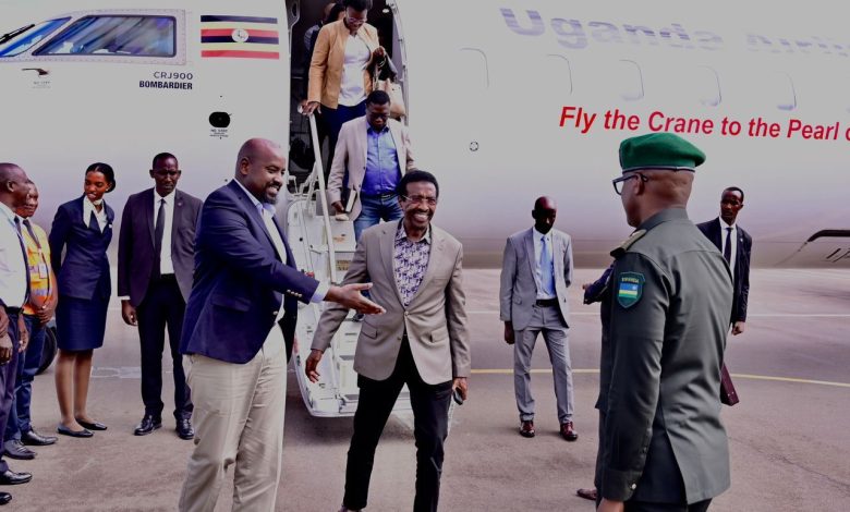 The General arrived at Kigali International Airport in the company of Justice and Constitution Affairs Minister Norbert Mao and Maj Gen Jim Muhwezi, the Minister of Security.