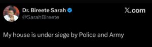 “My house is under siege by Police and Army.” Sarah Bireete on her X account