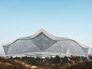 Positioned at the heart of the city’s Tianfu district, a new hub for finance, IT and biochemical industries, the building squats like an overfed prize fowl, teetering out in all directions and looming above a neighbouring art centre by Zaha Hadid – a dwarf in comparison, at 140,000 square metres. Its design, say the developers, is “themed with a comprehensive and profound oceanic culture and inspired by the design concept of sailing seagulls and undulating waves”.