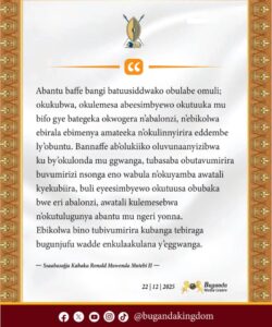 Mu bubaka bwe eri abantu ba Buganda ne Uganda yonna olw’okutuuka ku mazaalibwa ga Kulisito ag’omwaka guno 2025, Ssaabasajja Kabaka akkubiriza abantu okutereka emmere ey’ensigo mu byaagi basobole okuyita mu biseera ebijja olwokuba emmere ejja kuba ntono olw’omusana ogwayokya Kasooli n’ebirime ebirala.