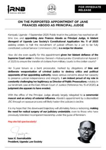 Kampala, Uganda – September 1, 2025 – The President of the Uganda Law Society (ULS), Isaac Ssemakadde, has sharply criticised the appointment of Jane Frances Abodo as Principal Judge, describing the move as a “recipe for disaster” and a further erosion of public trust in the judiciary.