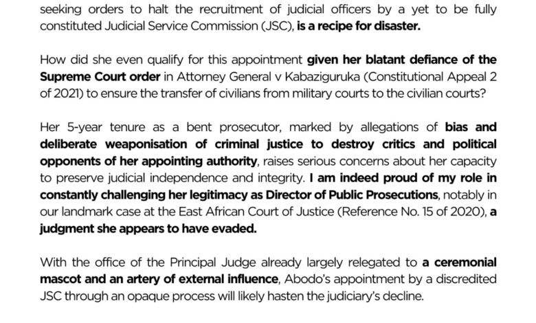 “The office of the Principal Judge has already been reduced to a ceremonial mascot and an artery of external influence,” Ssemakadde said, warning that Abodo’s rise to the position will entrench external interference and deepen public mistrust.