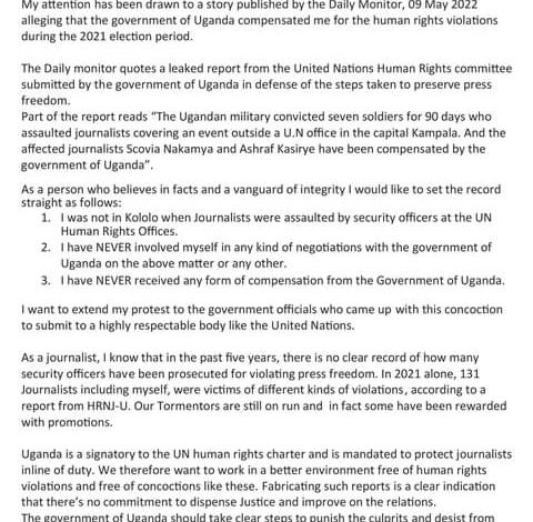 Culton Scovia Nakamya, a Ugandan top journalist plying her trade at bbs Television Uganda, has vehemently protested against fabricated lies that government has compensated her and other fellow journalists on harm inflicted on her during the time she was executing her duty last year 2021.