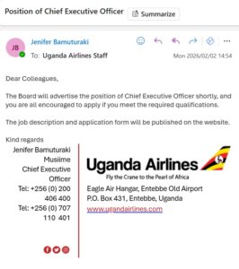 In an email addressed to Uganda Airlines staff, the current Chief Executive Officer, Ms. Jennifer Bamuturaki Musiime, informed employees that the Board will shortly advertise the CEO position and encouraged qualified internal staff to apply.