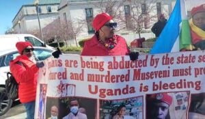 Amongst the protesters is a former Ghetto TV journalist Ashraf Kasirye who got shot by an errant police officer RPC Enock Abaine during a 2021 campaign trail in Masaka district. The protesters were holding placards inscribed with images of victims of brutality and those who were killed during the security clashes.