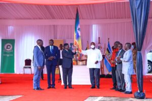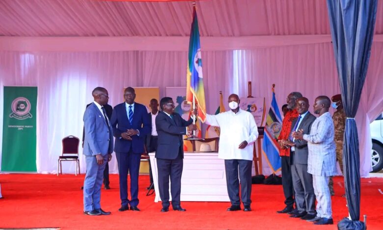 Norbert Mao, DP president handing over the IPOD stewardship to President Museveni of NRM
