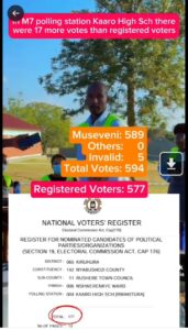 According to Kyagulanyi, an Electoral Commission presiding officer publicly declared that President Museveni garnered 589 votes, with five ballots recorded as invalid. However, official EC records indicate that the total number of registered voters at that polling station stands at 577.